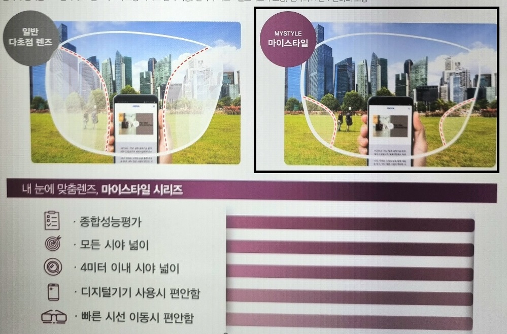일반 다초점렌즈와 비교할 때 마이스타일 제품은 종합성능평가에서도 높은 점수를 가지고 있으며, 시야폭이 넓어 다초점렌즈 부적응 현상이 다소 최소화가 되어있으며, 사용하기 편하다는 평을 가지고 있습니다. 대부분 안경을 구매하시고 다초점렌즈 사용은 조금씩 늘리는 편으로 사용하는데, 이 렌즈의 경우는 바로 사용하고, 착용하는 경우가 많아 어지러움을 느끼는 경우는 거의 없다고 볼 수 있었습니다.