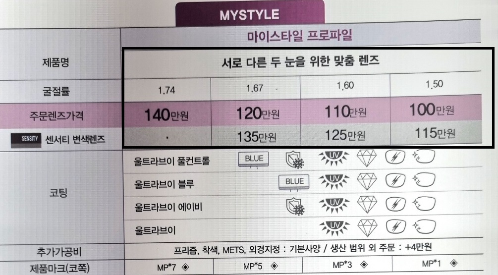 - 1.50 굴절률 다초점렌즈 가격 : 1,000,000원