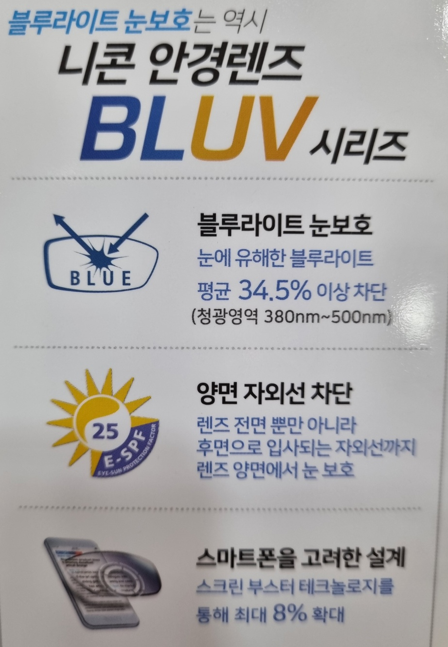 니콘 BLUV 안경렌즈의 경우 블루라이트로 인하 눈 보호가 강하게 나타납니다.