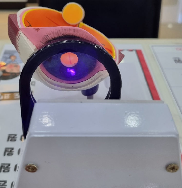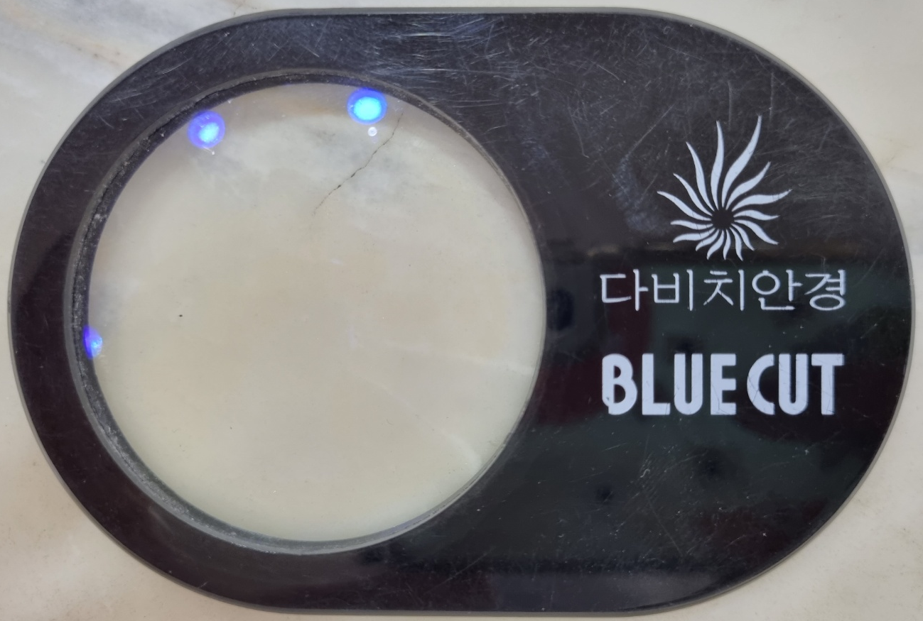 지금은 블루라이트 차단 렌즈를 눈앞에 두고 블루라이트 광선을 비췄을때에는